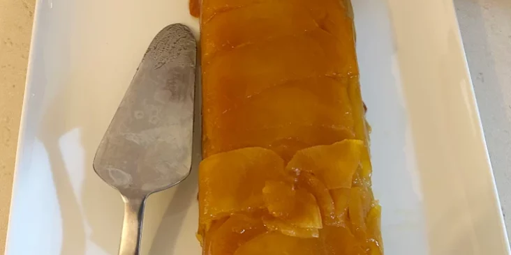 - superposer harmonieusement les lamelles de pommes dans le moule à cake, en quinconce et dans un sens puis dans l’autre, jusqu’à ce que les pommes débordent presque du plat.